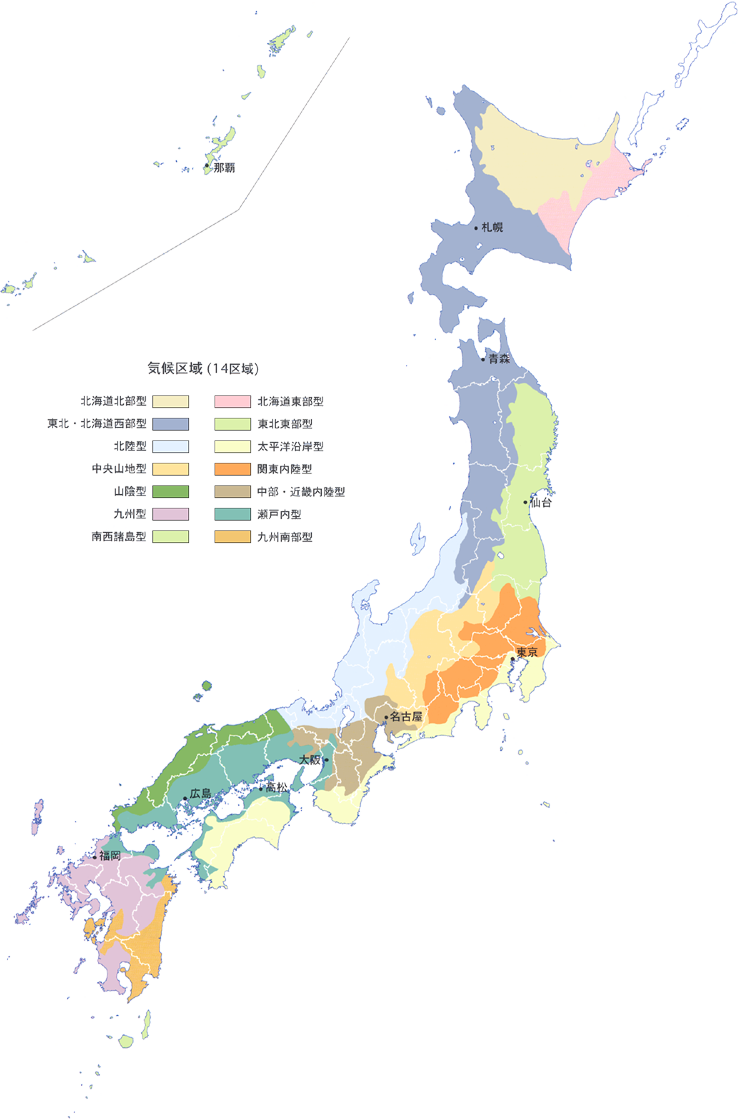 日本の気候は、14の気候区域にまとめることができます。これは日本の気候条件を概観する上で有効です。